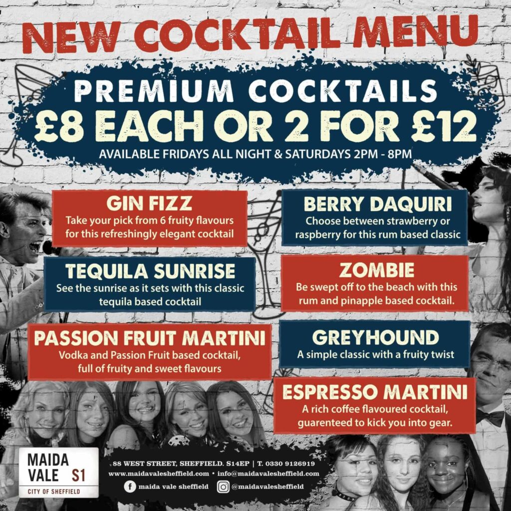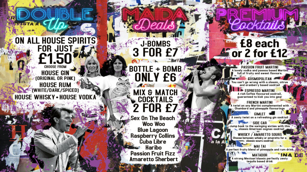 Welcome To Maida Vale Multi-award-winning bar located on West Street. Maida Vale offers an experience unlike any other, playing the best music from across the decades. Maida News & Events watch this space: Live music EVERY BANK HOLIDAY dont know where to start your friday nights, look no further: Why not try our brand new cocktail menu? Available all day Friday and Saturdays 2pm – 8pm Get Ready To get messy at Maida Mess Every Wednesday With The Cheap Student Drink Deals!